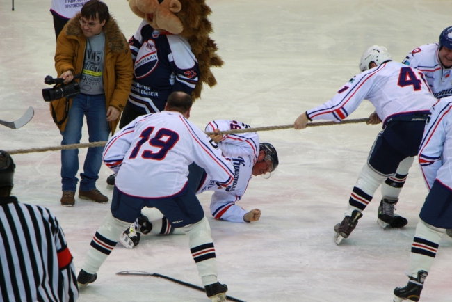 Затем руководству и болельщикам предложили состязания на скорость. Они должны были в эстафете по очереди доехать до спортинвентаря, разбросанного на льду, и положить его в спортивную сумку. Первыми удалось собраться команде чиновников и ветеранов хоккея. Победили они и в другом конкурсе – перетягивание каната. В итоге к началу матча в копилке этой команды на табло высветилось 2 очка.