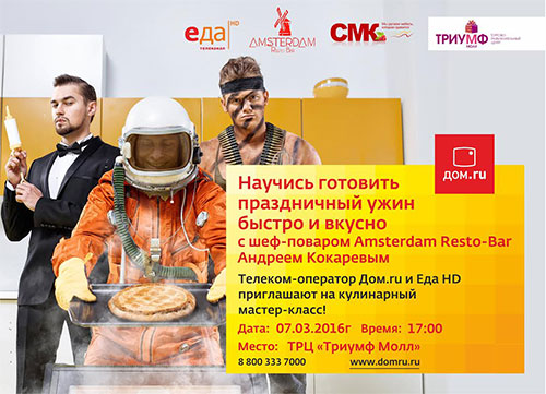 Подготовиться к празднику всех женщин и провести время со вкусом, приглашаем всех желающих 7 марта в 17:00 в ТРЦ «Триумф Молл». Здесь пройдет кулинарный мастер-класс, организованный телеком-оператором «Дом.ru» и телеканалом Еда HD при поддержке мебельной компании СМК и AMSTERDAM Resto-bar.
