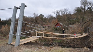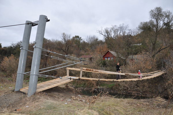 Поясняется, что подвесной мост длиною 40 метров соединяет центр города с пригородом. Сначала там убрали старое дощатое покрытие и сходы моста, потом перетянули тросы, уложили новое покрытие и установили ограждение. Сходы с моста сделаны в виде пандусов, чтобы было удобнее провозить детские коляски, грузовые тележки и проезжать на велосипедах.
