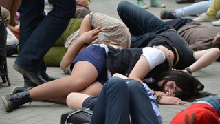 В Саратове завершился флешмоб «Упади замертво». 10 молодых людей расположились без движения на полу фруктового отдела гипермаркета «Магнит» по адресу улица Чернышевского, 56а.