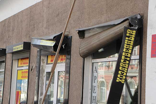 Во время падения кирпичи повредили вывеску и жалюзи, вход оказался заблокированным, т.к. кирпичная кладка оказалась как раз на крыльце перед дверью. Тем не менее, магазин работает в обычном режиме, только вход для посетителей с другой стороны.