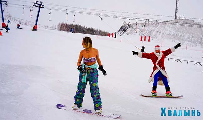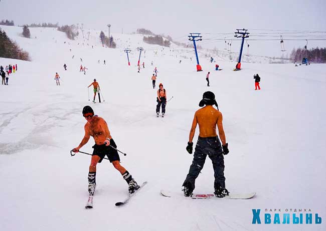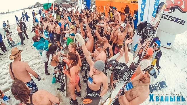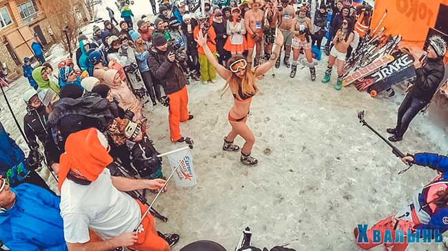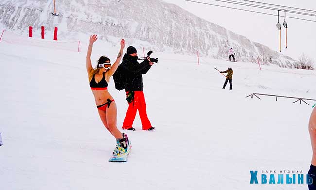 Некоторые участники флешмоба разделись совсем немного, например, сняв верхнюю одежду, другие были с голым торсом. Около сотни смельчаков вышли в трусах (парни) и в купальниках (девушки). Все они катались на лыжах и сноубордах.