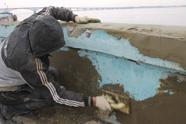 Даже неспециалисту ясно, что качество выполняемых работ оставляет желать лучшего. Так, штукатурку наносят без предварительных работ прямо на неочищенную поверхность, кое-где на старую краску. Слой штукатурки не всегда получается ровным, рабочие явно спешат.