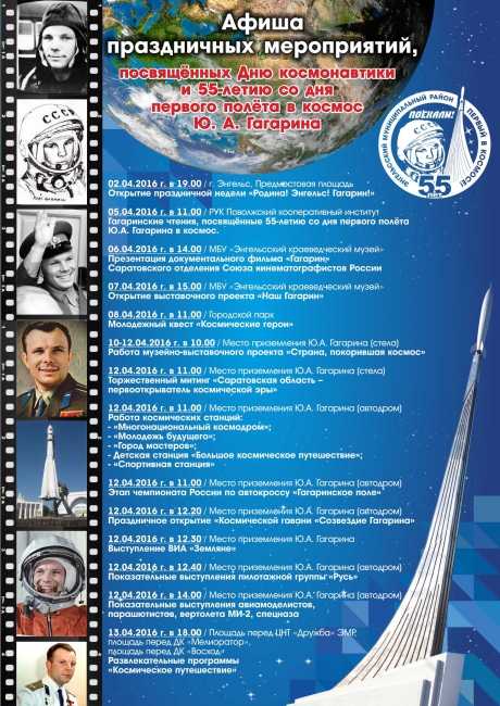 Юбилейные торжества, посвященные 55-летию первого полета человека в космос, пройдут в Энгельсском районе со 2 по 12 апреля 2016 года.