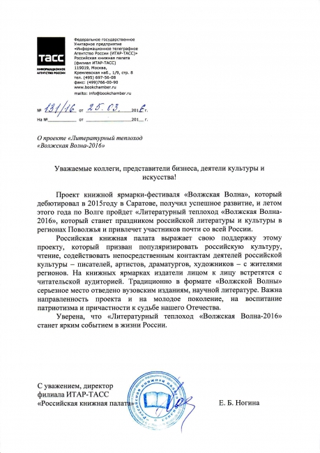 Российская книжная палата поддержала реализацию проекта «Литературный теплоход «Волжская волна-2016». В адрес инициаторов его проведения – Приволжской книжной палаты - поступило письмо от Елены Ногиной, директора филиала ИТАР-ТАСС «Российская книжная палата».
