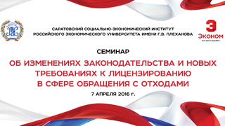 7 апреля 2016 года Саратовский социально-экономический институт РЭУ им. Г.В. Плеханова, в формате совещания совместно с Управлением федеральной службы по надзору в сфере природопользования (Росприроднадзора) по Саратовской области и Министерством природных ресурсов и экологии Саратовской области, проводит семинар: «Об изменениях законодательства и новых требованиях к лицензированию в сфере обращения с отходами».