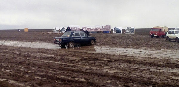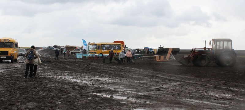 Продрогшие под дождем и градом представители СМИ даже не смогли попить чаю на «фестивале», поскольку электричество в палатках уже было отключено. Какие-то люди толкали застрявший в грязи автомобиль, в вольере грустил верблюд.