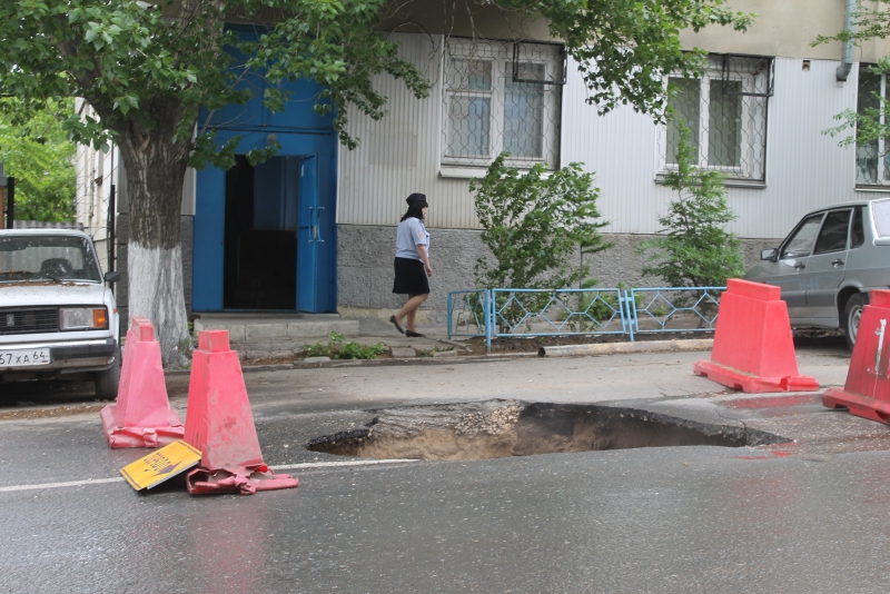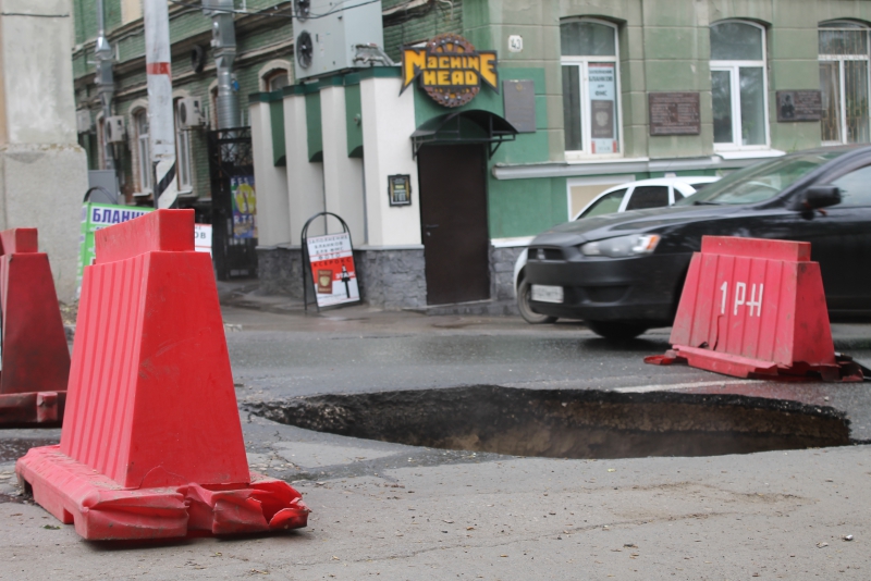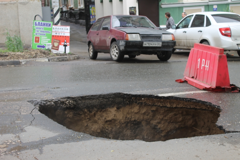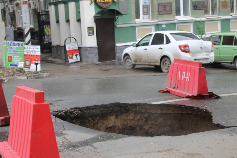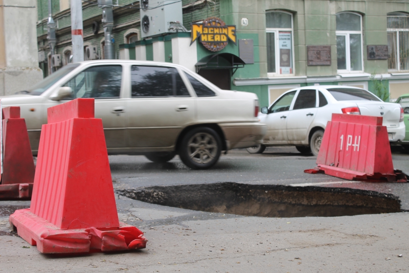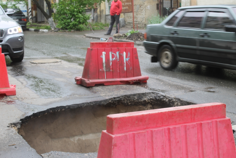 Сегодня в Волжском районе Саратова обвалилась проезжая часть улицы Октябрьская. Огромная яма образовалась напротив здания районной полиции напротив дома № 41. Ее огородили четырьмя конструкциями красного цвета. Также рядом с пластиковым барьером поставили знак «объезд», но почему-то в перевернутом виде.