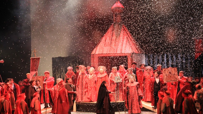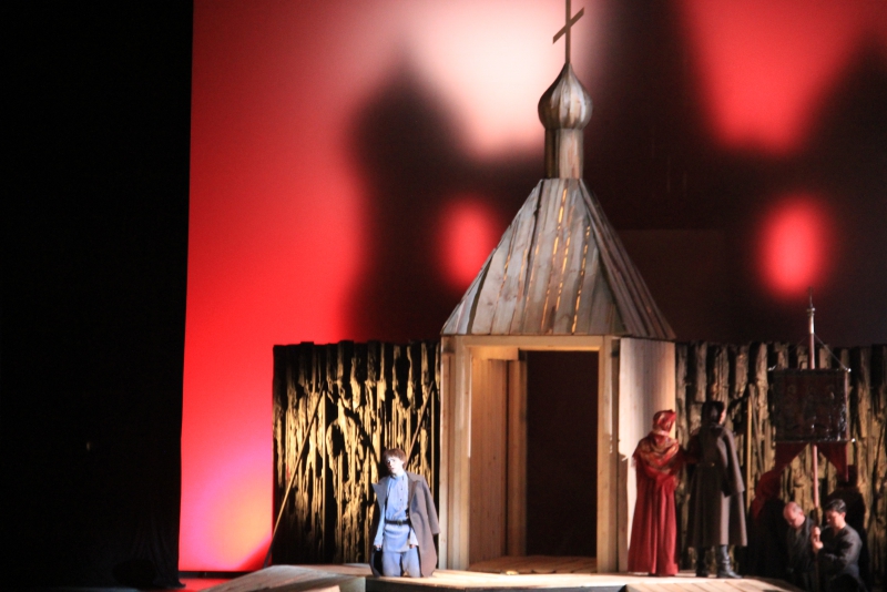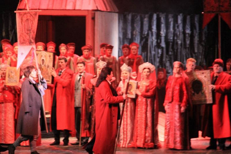 Действие сюжета разворачивается в 17 веке во время польской интервенции на Москву и восшествии на престол династии Романовых. Артистов хора художник-постановщик «одел» в костюмы самых разных эпох – от русского средневековья до наших дней. Вполне возможно, что таким образом постановщик реализовал свои политические аллюзии и осовременил классическое произведение, а не собирал в гардеробе театра мало-мальски подходящую одежду из-за скудости финансов.