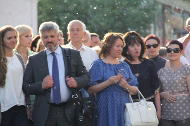 Высокопоставленные гости шли по Революционной, останавливались у каждой площадки, где им устраивали небольшое представление. Каждому хотелось сфотографировать губернатора Валерия Радаева, знаменитых артистов Ольгу Остроумову (председатель жюри) и Евгения Миронова (худрук фестиваля). Горожане стали потихоньку заполнять и проезжую часть улицы.