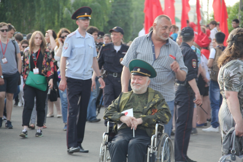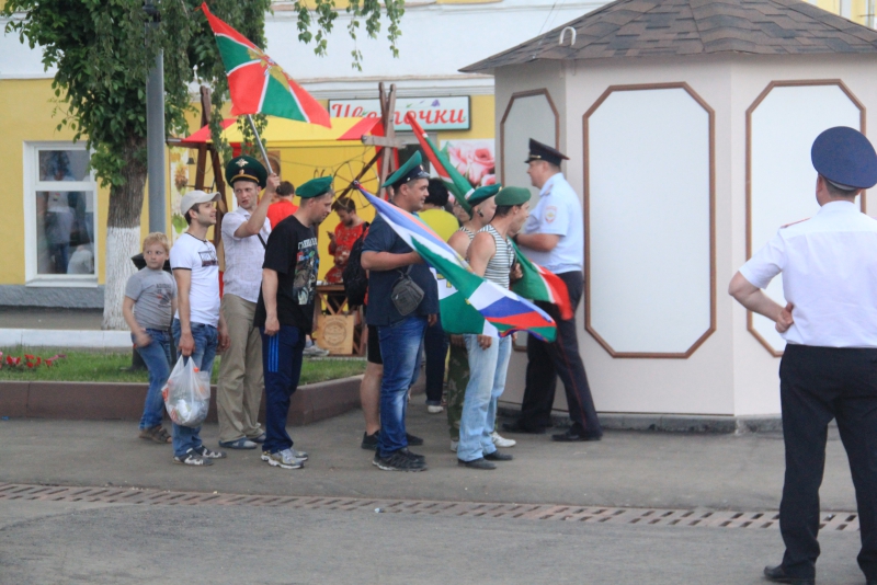 После того, как счастливые обладатели билетов на спектакль МХТ «Контрабас» с участием Константина Хабенского заполнили зрительный зал театра, улица Революционная быстро опустела. По ней с речевками и песнями, с флагами в руках прошла немногочисленная группа бывших пограничников. В этот день был и их праздник. Полицейские для проформы притормозили ребят, а потом дали им свободно пройти.