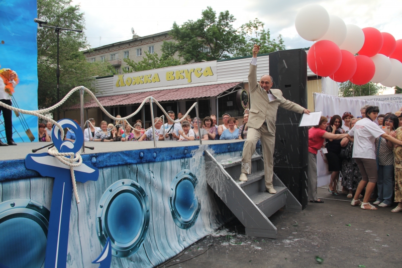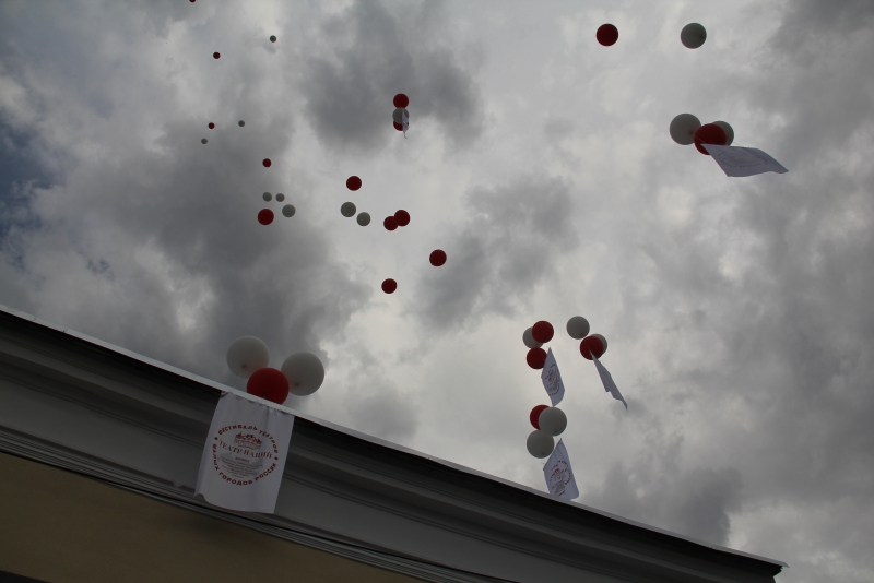 В конце официальной части об сцену разбили бутылку шампанского и запустили в небо шарики. Одна из гирлянд застряла на крыше драмтеатра, зацепившись за карниз.