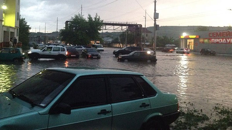 В низинах вода разлилась настолько широко, что сложно определить, где тротуар, а где проезжая часть.