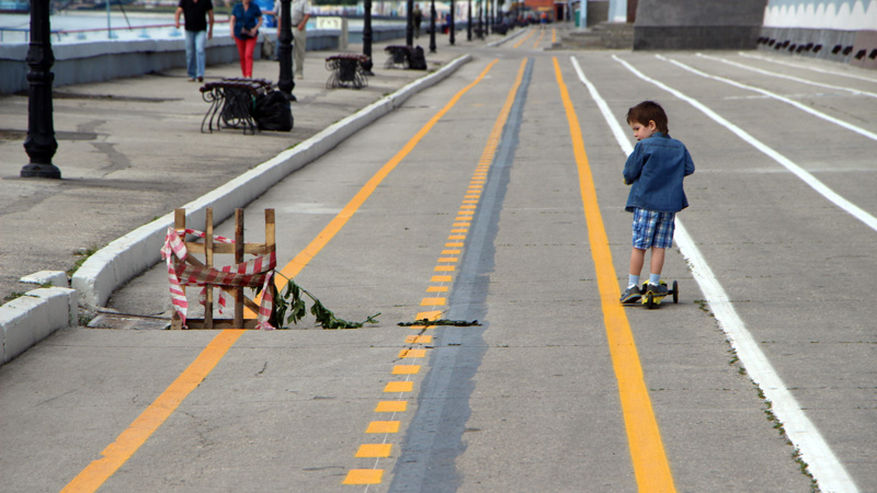 На Набережной Космонавтов в Саратове продолжает проваливаться асфальт. В эти выходные яма появилась на нижнем ярусе, где находится велодорожка.