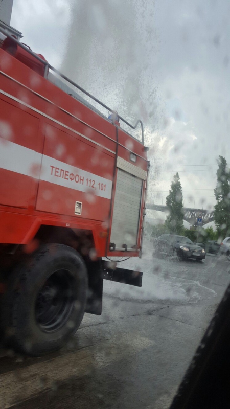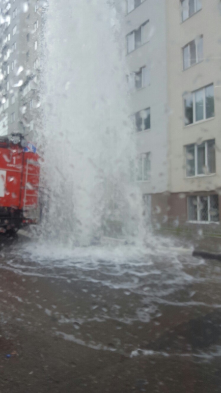 Фонтан бьет из открытого люка коммуникаций. В непосредственной близости от бьющего потока воды находятся автомобили пожарной охраны. Пользователи соцсетей высказывают версии, что гейзер забил в результате проверки пожарных гидрантов.