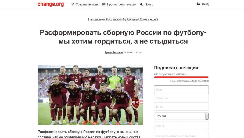 Петиция с требованием распустить сборную России по футболу, разочаровавшую болельщиков в финальной части чемпионата Европы 2016 года во Франции, стремительно набирает поддержку. Ее подписали уже более 450 тысяч человек. Автор петиции Артем Хасанов из Тюмени призывает на «сэкономленные» таким образом деньги построить футбольные поля и заниматься подрастающим поколением: «В это время, как в Новый год дети, все россияне ждут чуда, но вот уже десяток лет этого чуда НЕТ, может стоит что-то менять, может, мы пропустили что-то важное».