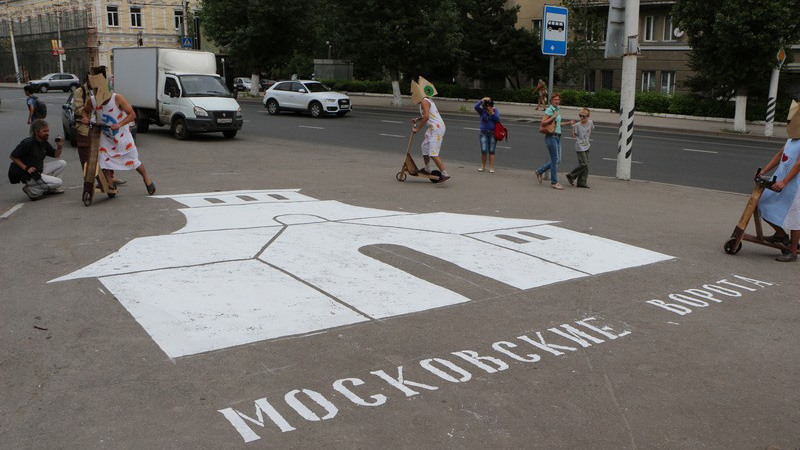После этого участникам пресс-тура предложили переместиться в сквер Первой учительницы. Там Сорокин рассказал, что место, где в настоящее время расположен фонтан, являлось центральной точкой крепости. На выходе из сквера посреди тротуара один из художников нарисовал Московские ворота, которые там когда-то якобы были. Вокруг рисунка на деревянных самокатах ездили три человека с картонками на голове. Они изображали стерлядей, являющихся символом Саратова. Перфоманс, впрочем, не особо удивлял прохожих, лишь несколько человек немного заинтересовались происходящим.