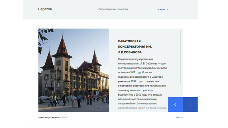 Первый этап отбора завершился вчера. С 28 июня по 28 июля все желающие предлагали один географический объект и не более четырех ассоциированных с ним символов. После того, как количество голосов за символ достигало пяти тысяч, он появлялся на интерактивной карте на сайте Твоя-россия.рф с привязкой к территории. По результатам первого этапа во второй вышли 49 городов – номинантов и 79 символов – лидеров. В их числе – Саратов, сказано в сообщении на сайте администрации областного центра.