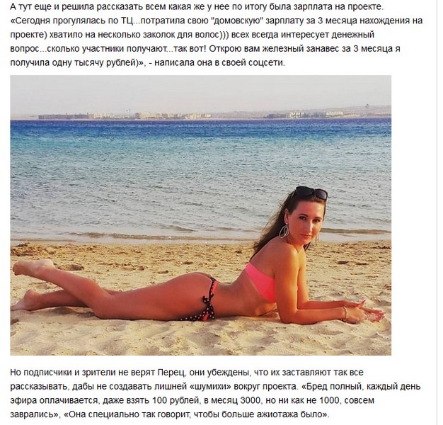 Вместе с тем, уйти с проекта она решила, оставив скандальное сообщение, пишет paparazzi.ru. На своей странице в Инстаграмме* Евгения Перец рассказала, как за все 3 месяца она получила всего лишь одну тысячу рублей. Девушка указала, что прогулялась по торговому центру и «потратила свою «домовскую» зарплату за 3 месяца нахождения на проекте». «Хватило на несколько заколок для волос», - заявила саратовчанка.