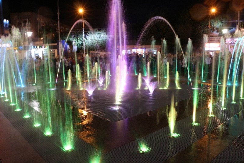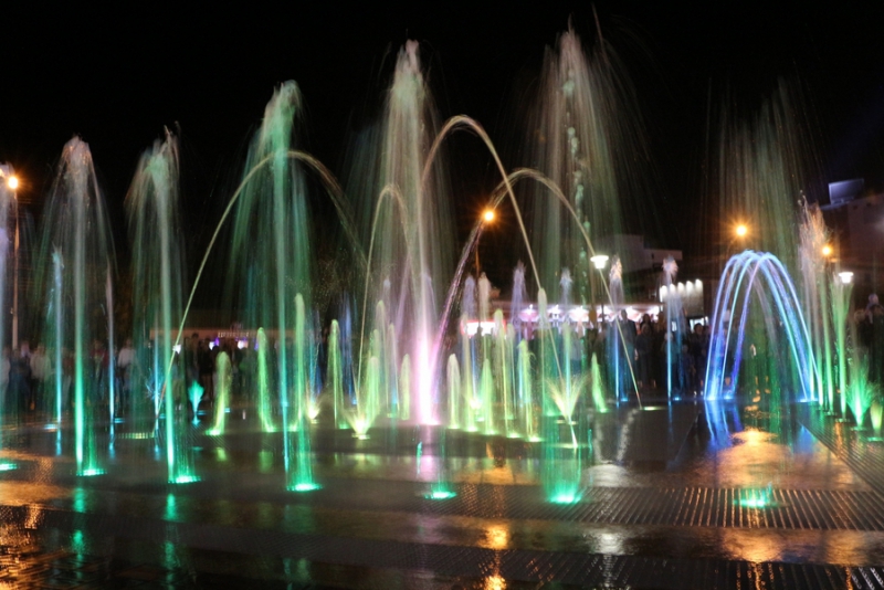 Церемония началась в 19.00, на сцене выступили танцевальные и вокальные коллективы города. В это время уникальный фонтан переливался различными цветами подсветки. Видимо, из-за холодной погоды смельчаков побегать под струями плоскостного фонтана не нашлось.
