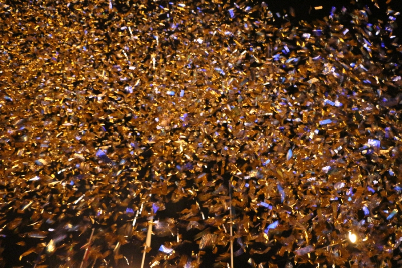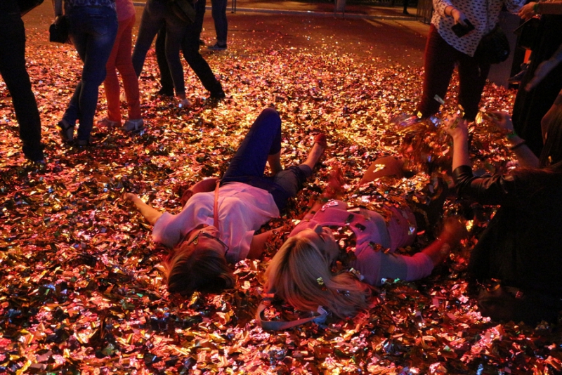 Некоторые подбирали с земли разбросанную повсюду нарезку блестящей пленки и подбрасывали ее вверх. Самые разгоряченные сегодняшним праздником ложились на асфальт и закапывались в мишуру.