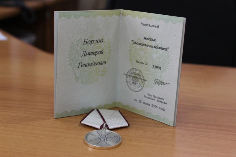 Сегодня полицейский из Хвалынского района Саратовской области Дмитрий Борзов получил награду за спасение людей во время стихийного бедствия. Медаль «За спасение погибавших» вручил Борзову начальник ГУ МВД Сергей Аренин во время сегодняшнего развода.
