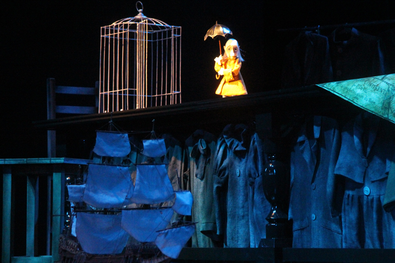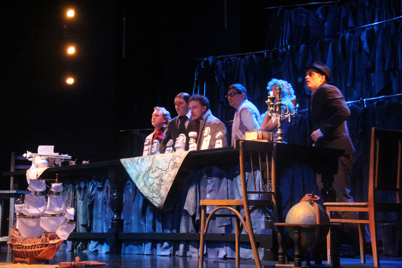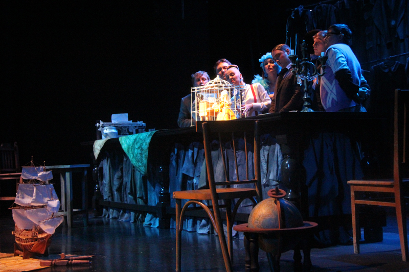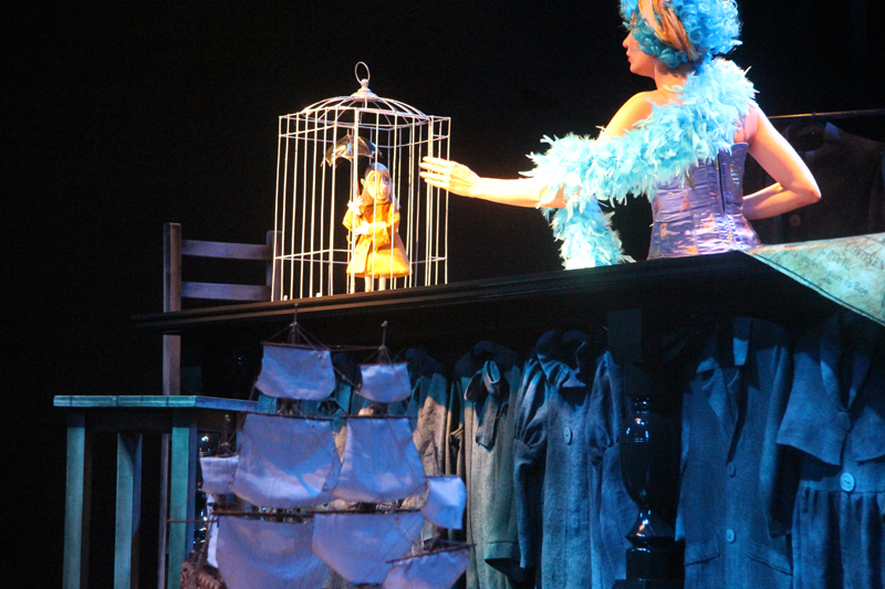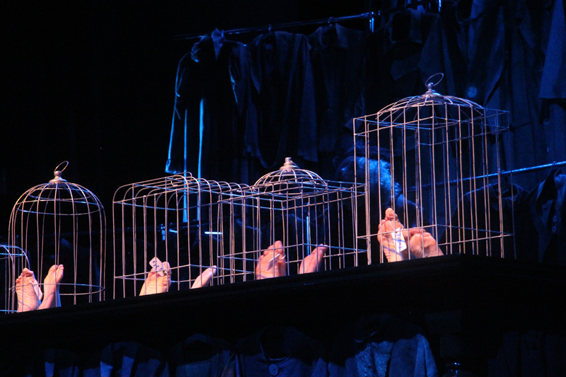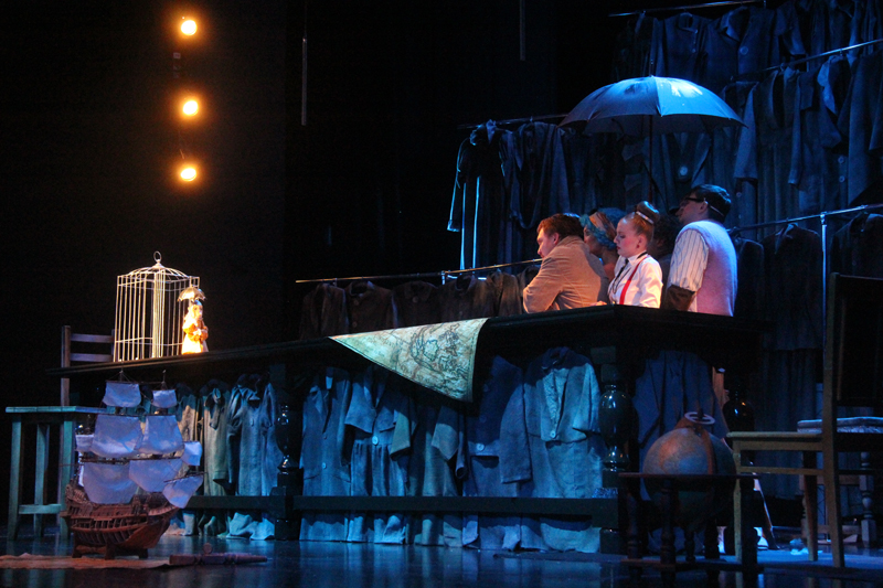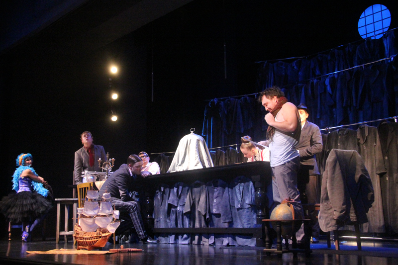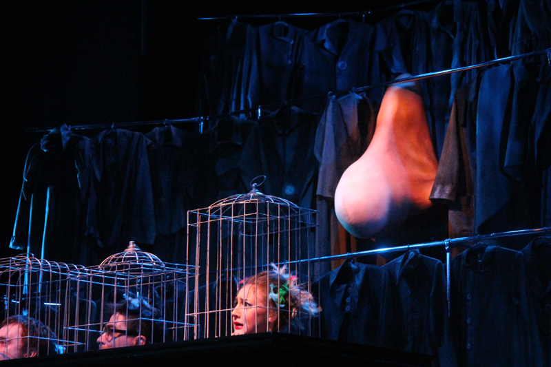 Художник Александр Ечеин создал на сцене удивительно мрачный, но яркий мир: мы словно внутри великанского гардероба, который, в свою очередь, находится внутри каюты, но эта каюта – не что иное, как клетка, ведь иллюминатор зарешечен. Это художественное воплощение идеи режиссера – многослойность событий, мыслей и образов раскрывается постепенно.