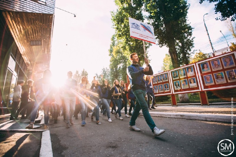 Парад российского студенчества прошел в Саратове впервые. Праздничное шествие началось у первого учебного корпуса СГЮА, откуда студенты ведущих вузов города стройными колоннами двинулись к площади перед главным корпусом академии.