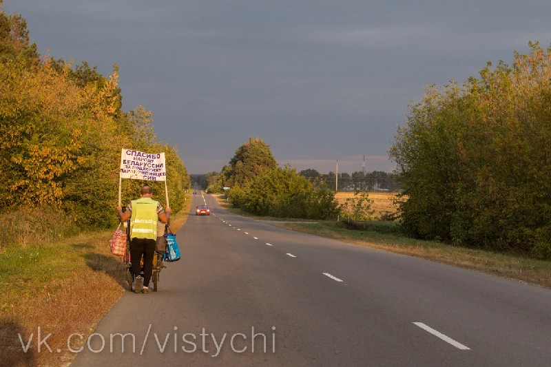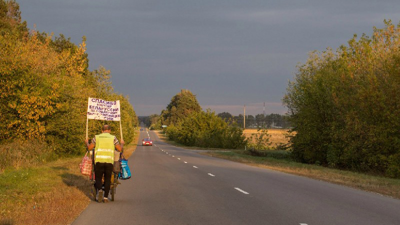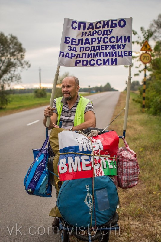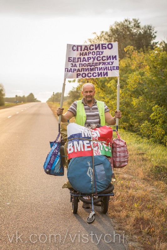 Саратовского пенсионера заметили еще 22 сентября на дороге Р134 Мотыкалы – Жабинка. У него к тележке был прикреплен транспарант с надписью «Спасибо народу Беларуссии за поддержку паралимпийцев России» (орфография сохранена). К небольшому набору вещей (палатка, спальник, теплая одежда, продукты, радиоприемник и туристическая плитка) он прицепил также скрепленные вместе флаги России и Белоруссии, на которых сказано «Мы вместе!».