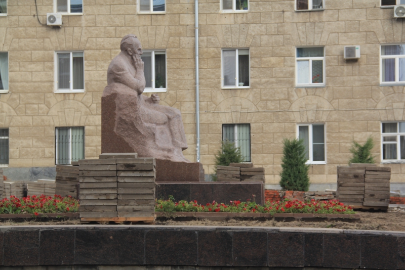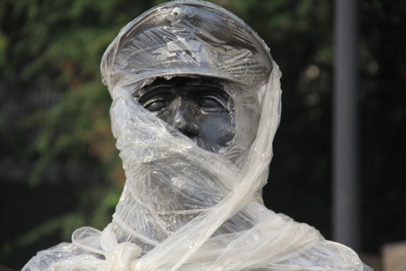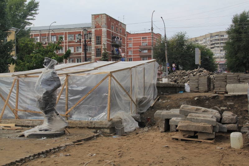 В этом смогли убедиться общественники, которые сегодня инспектировали работы на пешеходной зоне от сада «Липки» до Набережной. В полиэтилен завернули скульптуру городового. Правда, открытым оставили лицо статуи. «Чтобы все видел и наблюдал», - пошутили общественники.