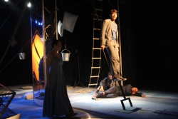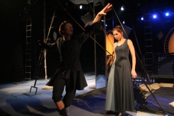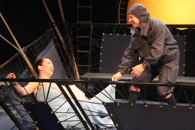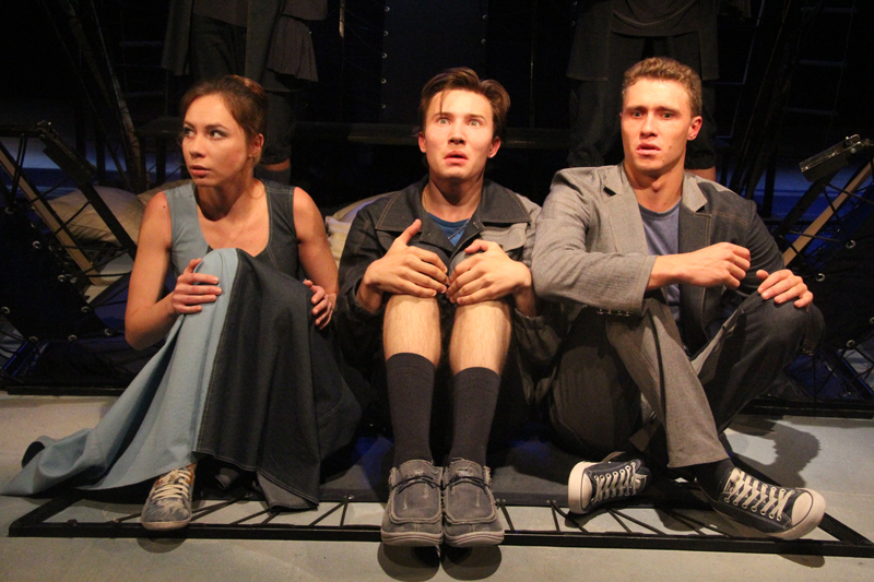 В корзине воздушного шара, в которую в этот вечер превратилась Малая сцена театра (сценография Юрия Наместникова), Он (Валерий Малинин), Она (Татьяна Родионова) и инструктор (заслуженный артист России Владимир Назаров) поднимаются вверх.