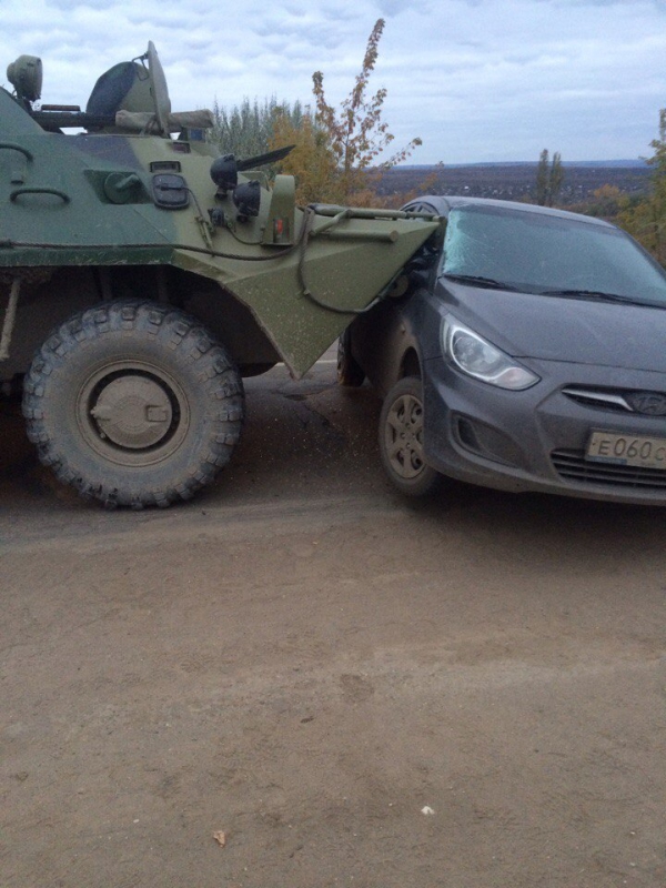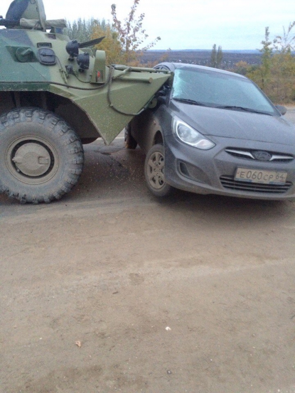 В районе поселка Соколовый БТР врезался в «Хендай Солярис». Иномарка получила существенные технические повреждения. Судя по снимкам, в результате ДТП пострадавших нет.