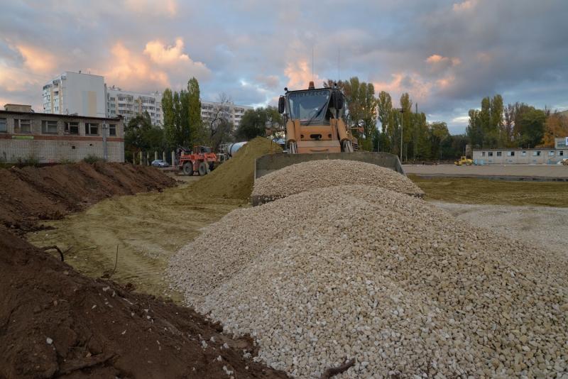 На строительстве здания под серфинг и скалодром ведутся работы по планированию земельного участка, вывозится грунт и асфальтобетонный лом.