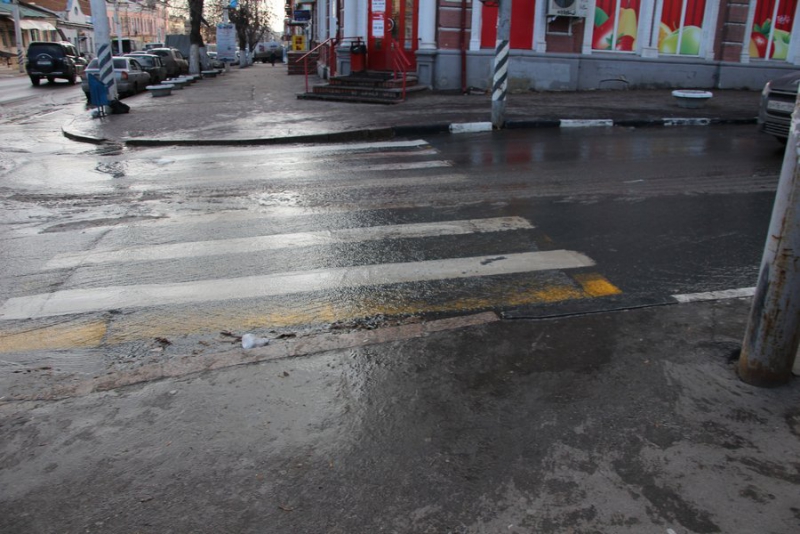 На пересечении Соборной и Московской «река» затопила пешеходный переход, на котором уже образовалась наледь. На глазах корреспондента «4В» несколько человек, пытаясь перепрыгнуть ручей, чуть не упали.