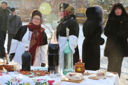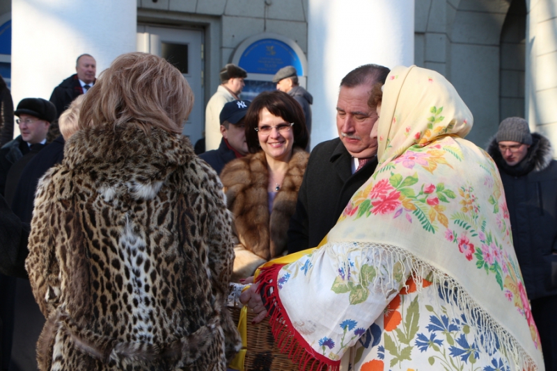 Далее глава региона отправился в театр, где в фойе его уже ожидали представители всех муниципальных районов, облаченные в костюмы-символы их родной земли. Три девушки в кокошниках преподнесли ему саратовский каравай. Валерий Радаев попробовал небольшой кусочек и пошел осматривать выставку достижений региона.