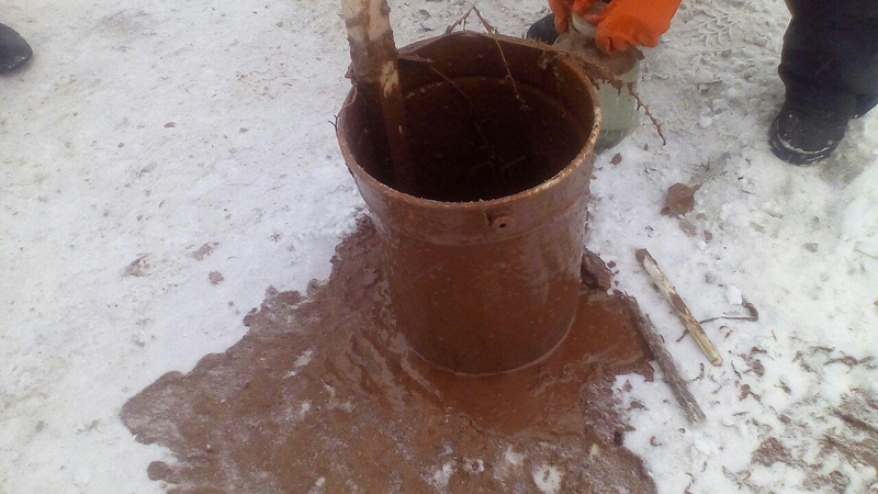 В настоящее время на набережной вокруг излива загрязняющих веществ убраны заградительные боны. Полынья с коричневой жижей «обросла» льдом. На обочине дороги у места излива припаркованы транспортные средства МУПа, службы спасения и автомобиль экологической лаборатории, а также лодка. На берегу находятся порядка 10 человек. Один из них в защитной одежде с помощью ведра, закрепленного на шесте, собирает с поверхности реки нефтепродукты. Еще один работник с помощью якоря достает из реки загрязненные ветки кустарников.
