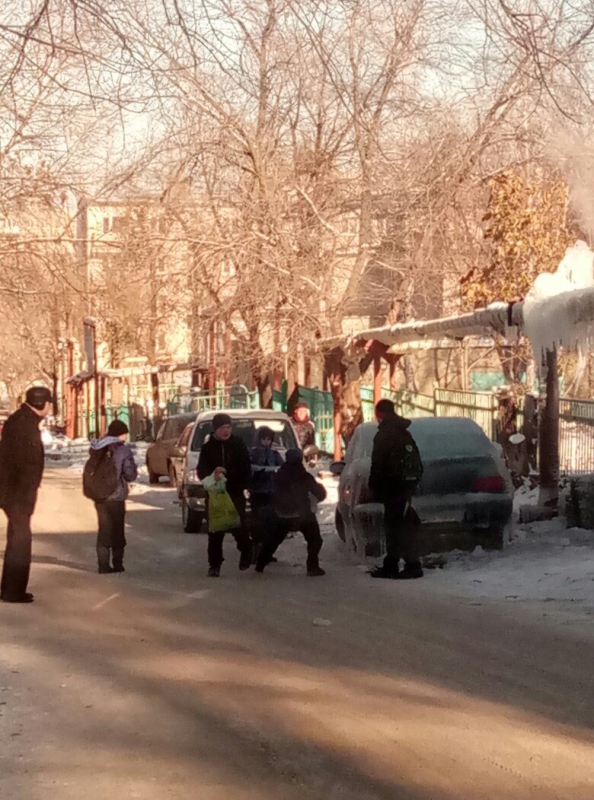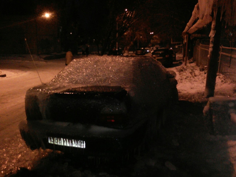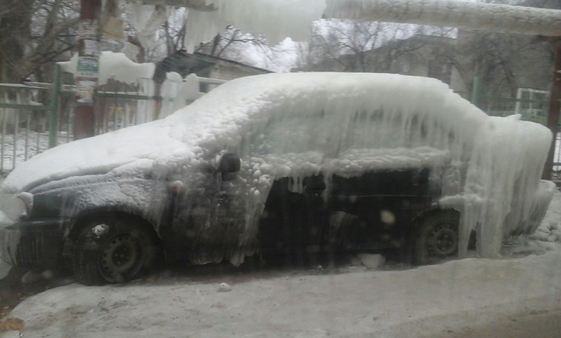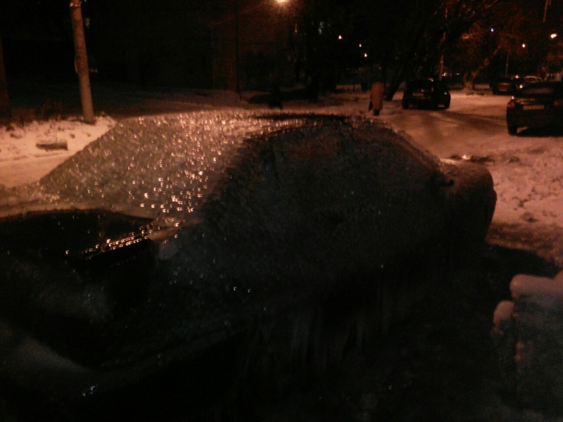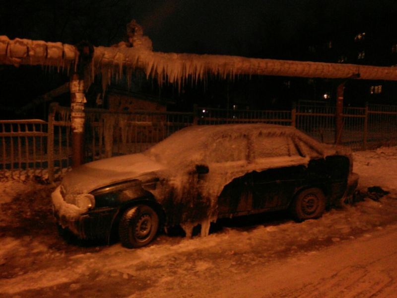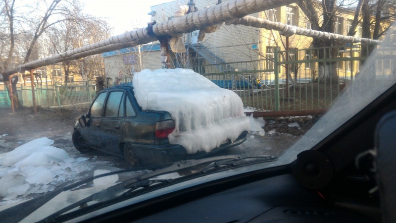 Автомашина «Дэу Нексия» находится на 1-м проезде Панфилова на 6-й Дачной, по соседству располагается забор школы №100. Фотографии замороженного транспортного средства начали публиковать с середины ноября, когда стояли сильные морозы. Вероятно, автомобиль покрывается льдом из-за коммунальной аварии на теплотрассе.