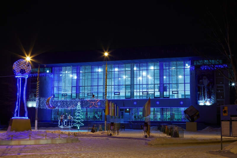 Задолго до боя курантов заиграл красочными огнями городской стадион и спортивный комплекс энгельсской Детско-юношеской спортивной школы. Прямо у входа на стадион заработал световой фонтан, юных спортсменов и болельщиков здесь также встречают светящиеся олени, елки, снеговики, сказочные персонажи. С наступлением вечера здание ДЮСШ становится похожим на сказочный дворец – весь фасад украшен синими гирляндами, снежинками и звездами. В этом году на территории ДЮСШ появился еще один объект, украшенный новогодней иллюминацией, - постамент с огромным футбольным мячом.