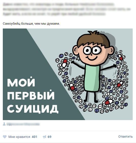 Корреспондент ИГ «Четвертая Власть» изучил контент наиболее популярных групп в соцсети «ВКонтакте» предположительно суицидальной направленности. Подобных сообществ очень много, некоторые из них являются открытыми, то есть доступ к ним никак не ограничен. В данных группах не содержится конкретных призывов к действиям, которые могут привести к кончине, однако много записей о несчастной жизни и «бренности бытия». Например, записи и картинки о безответной любви и предательствах. В закрытых группах выкладываются фотографии изрезанных рук, в шутливой форме описываются способы совершения суицида.