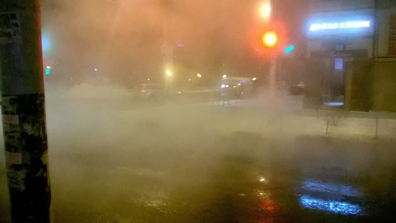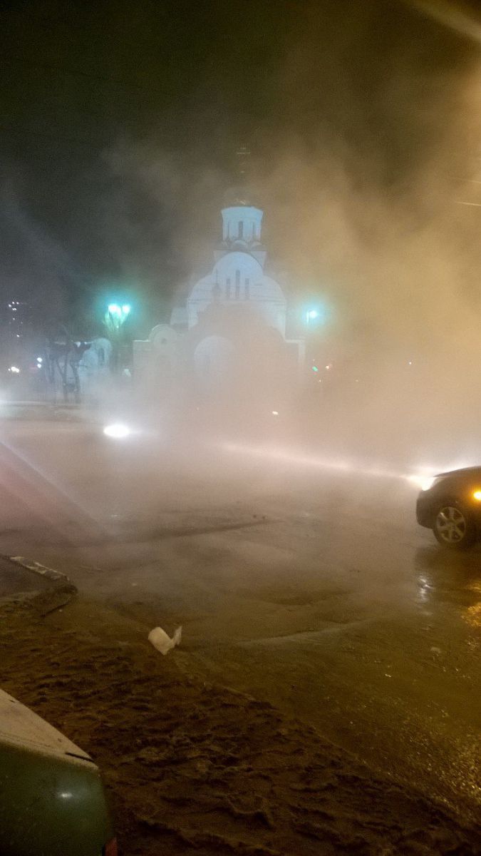 Вероятно, на пересечении улиц Советская и Пугачева произошел порыв трубы. Сотрудники коммунальных служб на месте происшествия не производили вскрышные работы, аварию уже ликвидировали. Сейчас движение по перекрестку свободно от наледи и «искусственного тумана».
