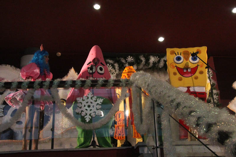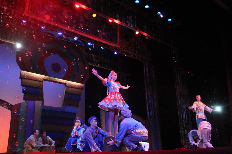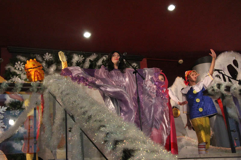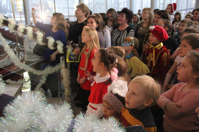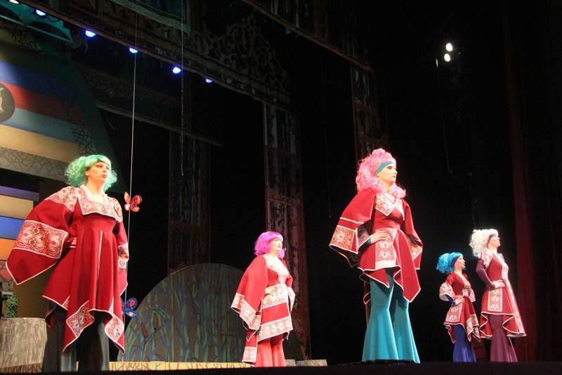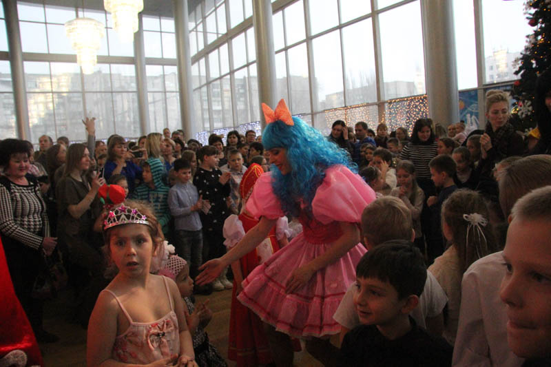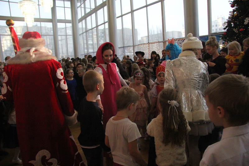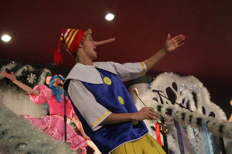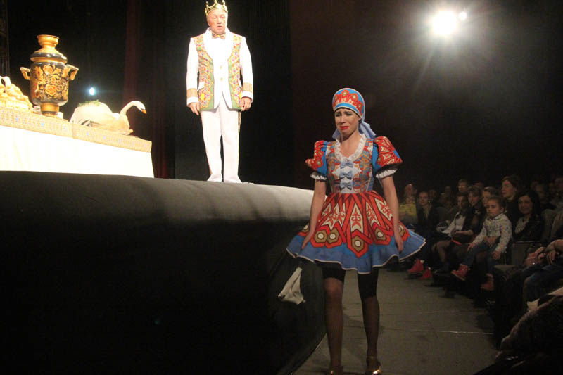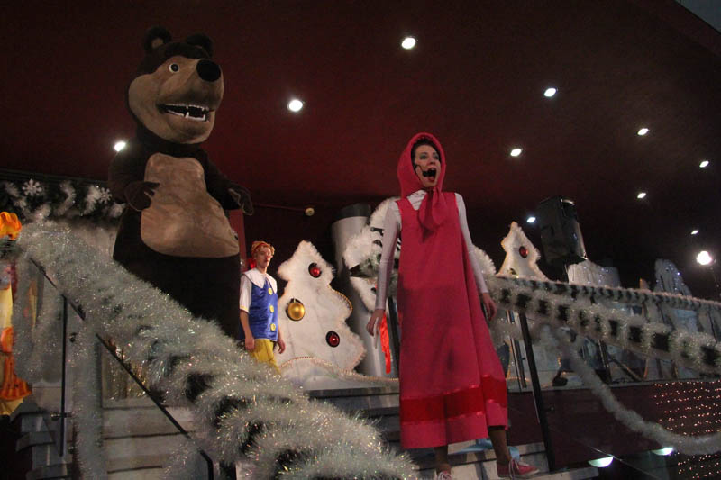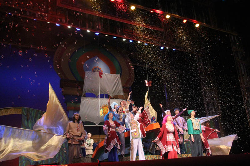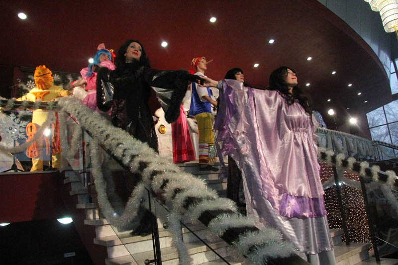 Перед спектаклем, как всегда, в фойе театра для детей была рассказана история, в которой мультяшные персонажи спасали Деда Мороза и Снегурочку. Губка Боб, Буратино и Мальвина, Маша и Медведь помогали ребятам разгадать загадки, вместе с ними пели и танцевали, а когда долгожданные огоньки зажглись на елке – организовали хоровод. Так интермедия подготовила маленьких зрителей к спектаклю по русской народной сказке «Летучий корабль», больше знакомой и взрослым, и детям по мультфильму Гарри Бардина.