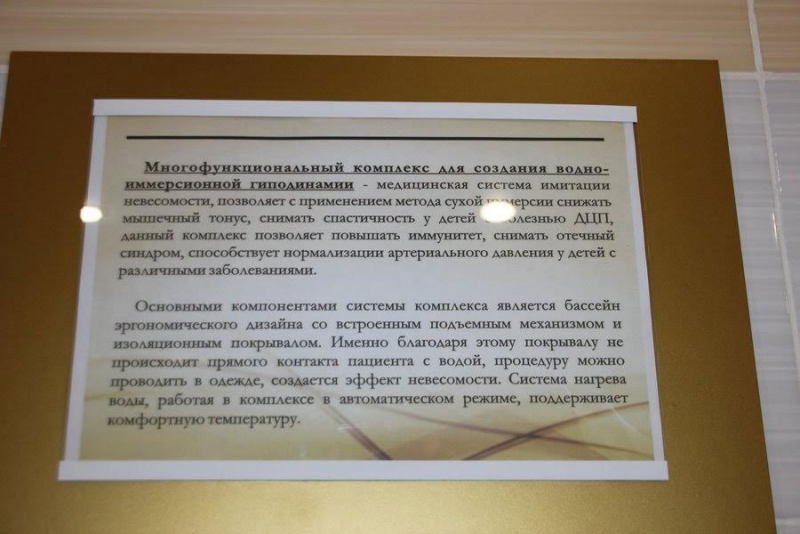 Радаеву показали иммерсионную ванну и рассказали, каким образом она работает. Специалист отметил, что такой аппарат есть только в Москве. Изначально использовались для изучения процессов реакции организма в невесомости. Его использовали для подготовки космонавтов, но потом врачи поняли, что с помощью этого аппарата можно лечить людей с ДЦП.