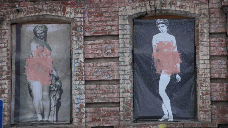 Замазаны краской 6 из 8 картин. Хулиганы не тронули те баннеры, где грудь и живот прикрыты одеждой.