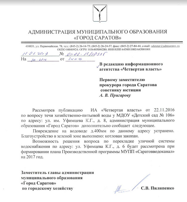 «Повреждение на водоводе д. 400мм по данному адресу устранено. Благоустройство в зеленой зоне выполнено: котлован закопан. Возможность решения вопроса по перекладке уличной системы водоснабжения по адресу: ул.Уфимцева К.Г. д.6 будет рассмотрена при формировании плана Производственной программы МУПП «Саратовводоканал» на 2017 год», – сообщил замглавы по городскому хозяйству администрации Саратова Сергей Пилипенко.