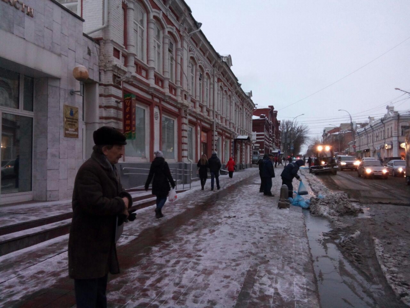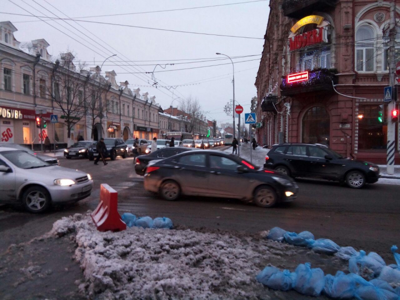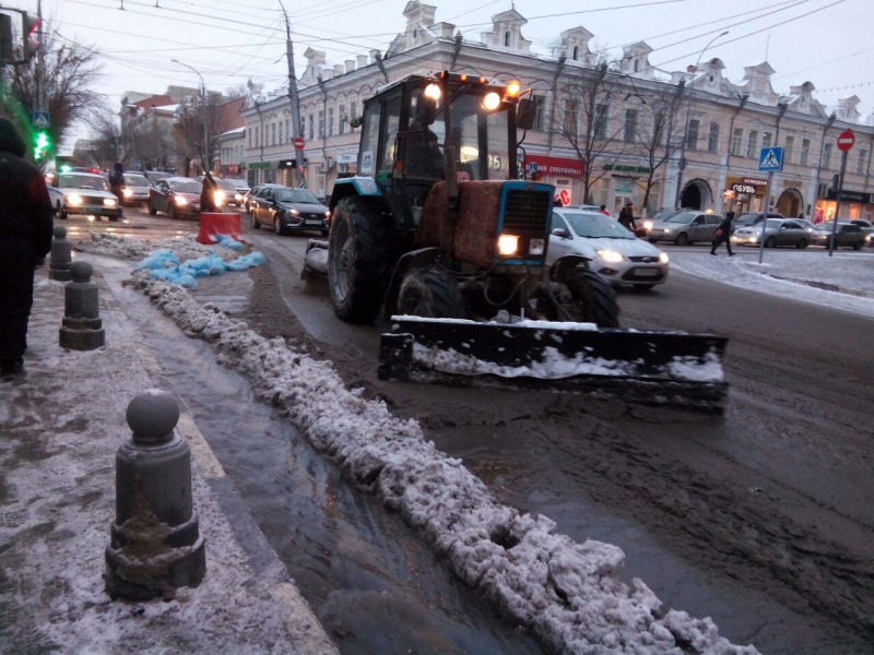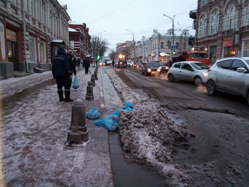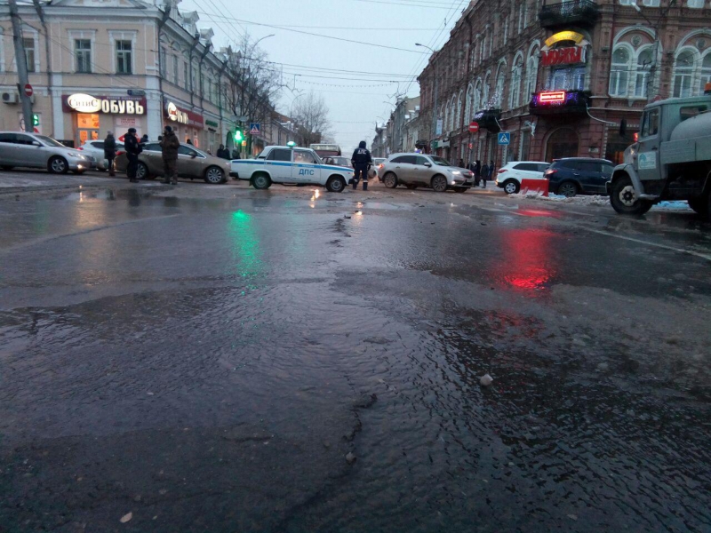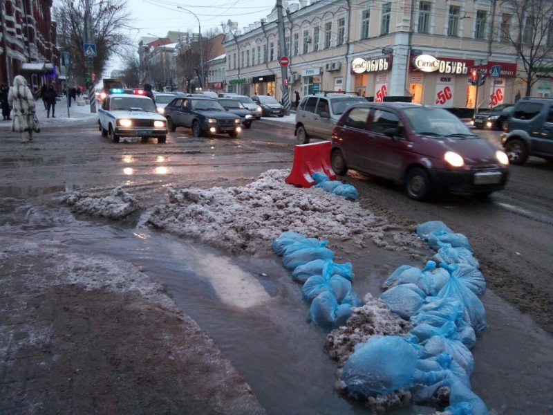 На месте аварии работают сотрудники МУП «Водосток». Они обложили место прорыва мешками с песком, чтобы вода не стекала на улицу Горького. Также они пытаются прочистить ливневый колодец и направить туда потоки.
