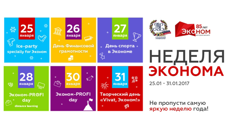 Каждый день с 25 по 31 января все желающие смогут не только побывать в Экономе, но и познакомиться со студенческой жизнью вуза. Гостей ждут каток, бассейн, спортивные, развлекательные, образовательные мероприятия, интеллектуальные игры, встречи с известными людьми и много подарков. «Неделя Эконома» – шанс для каждого на неделю стать частью института.