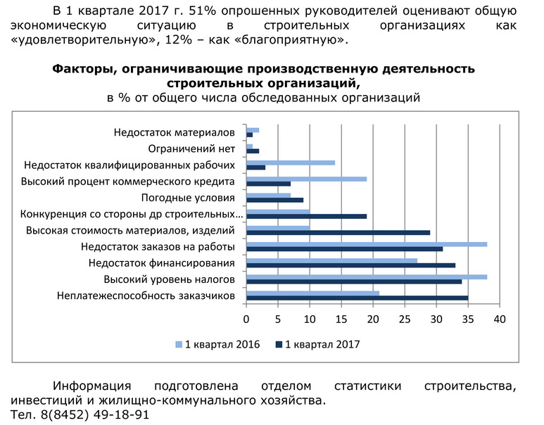 Согласно исследованию, за 1-й квартал 2016 года жаловавшихся на дороговизну было 10%, а спустя год их количество выросло почти до 30%. Больше всего в настоящее время ограничивает производственную деятельность строителей недостаток заказов на работы и высокий уровень налогов (по 38% опрошенных), за год их число выросло.
