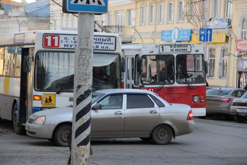 ДТП с участием 11-го автобуса и «Лады приоры» в центре Саратова на углу улиц Московской и Некрасова сильно затрудняет движение в сторону железнодорожного вокзала.