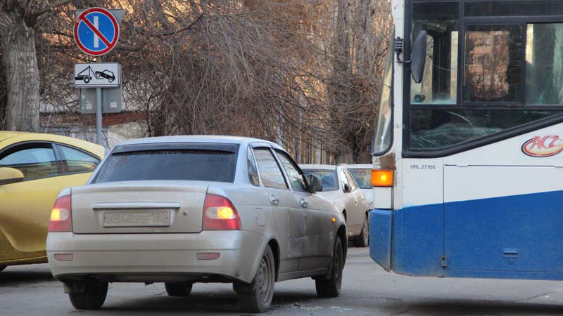 В результате аварии отечественная легковушка, нарушившая правила приоритетного проезда дорог, заблокировала единственную выделенную полосу для общественного транспорта. Стоящие авто пытаются по «встречке» объезжать маршрутки и троллейбусы.