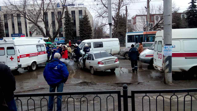 Сегодня утром в Саратове на пересечении проспекта 50 лет Октября и Деловой произошло массовое ДТП, столкнулись три автомобиля - «Деу Нексия», грузопассажирская «ГАЗель» и кроссовер «КИА Спортейдж».